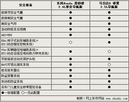 从主动安全配置上,思铂睿和马自达6睿翼都标配了ABS+EBD,思铂睿配备了VSA+EPS,能够有效保证车辆在行驶中的稳定性,马自达6睿翼配备了EBA+DSC,在应对湿滑路面等条件时也能轻松驾驭。 被动安全方面,两款车都配备了前排安全气囊,侧气囊和侧气帘。为了保障车辆安全,防盗报警、发动机防盗、8个探头的前后驻车雷达都成为标配,而思铂睿的NAVI可视化倒车系统让驾驶者在遇到复杂的倒车环境时显得轻而易举。