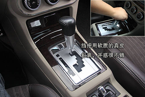 CVT无级变速箱外表很漂亮,它的挡把用真皮包裹,并且是用高档轿车挡把的缝制方法加工的,手感非常不错。