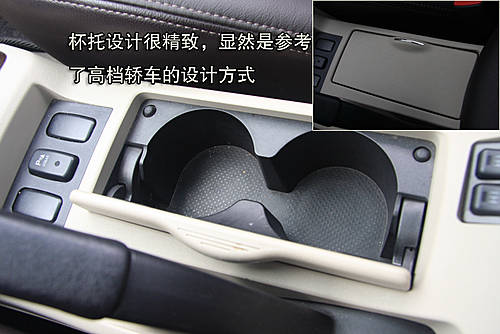 杯托的制造工艺借鉴了高档轿车杯托的设计,一个可以折叠的杯托盖改善了视觉效果。