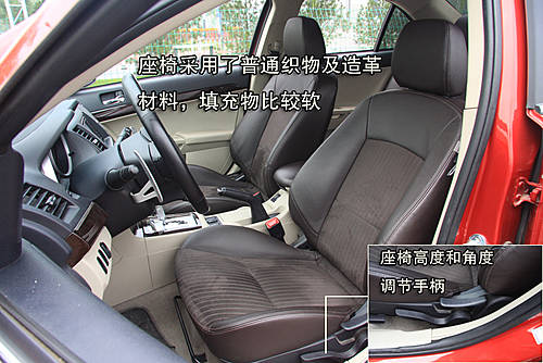 座椅采用了普通织物材料和造革材料,填充物比较软。前排驾驶座椅为手动调节,各调节控制键设计很合理,操作起来比较方便。后排座椅尺寸和前座椅相仿,因而在后座位舒适性方面表现不错。