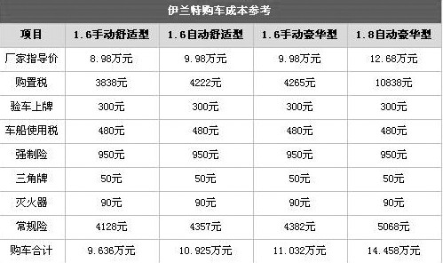 一、购车成本,伊兰特1.6的排量性价比较好,1.8排量车型不仅购置税没有优惠,而且裸车的费用高出1.6很多。其中1.6手动舒适型和1.6手动豪华型更适合家庭用户选购。