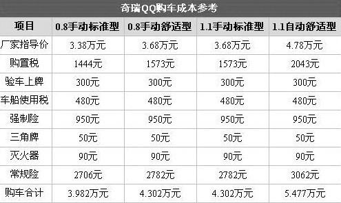 一、购车成本,奇瑞QQ的0.8手动标准低廉的价格,非常适合资金不足的消费者,够用的配置,较好的油耗能够满足众多用户的需要。1.1手动标准版合理的价位,较高的配置,更适合大众群体选购。