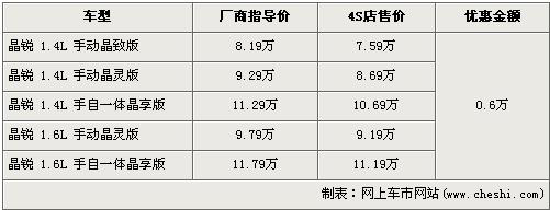 据4S店销售人员介绍:目前晶锐全系优惠6000元,最低仅售7.59万。晶锐目前现车较为充足,颜色较齐全,只是个别车型无现车,颜色不齐全。如需要预订车辆,最短需等2周时间,最长需等一个半月。