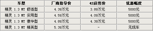 据长城汽车4S店销售人员介绍,长城汽车老款精灵目前大部分车型还有现车,只是颜色并不齐全,而精英型目前没有现车,也无法接受预订。另外,长城汽车老款精灵全系可以优惠5000元现金,最低售价仅为3.89万元。