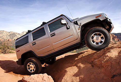 悍马是世界上最名副其实的4驱越野车之一,多年来一直傲视群雄。前悬挂采用上下悬挂臂式加液压减震器和扭力杆相配合后悬挂为5连杆实心轴加圈弹簧。由于有CTIS(Central Tire Inflation System)系统,所以轮胎气压可由驾驶员自行控制。全钢制造的梯形独立大梁,与中型卡车的底盘大梁不相上下底盘下部非常平坦,这也是出色的设计,在越野时它不怕被卡住。新的Borg-Warner双速电子控制全时4驱系统成为H2的标准配备。在必要的时候,可将车辆的传动比率减至2.64:1,以翻越更艰苦的障碍物。当选择“High Open” 模式或将差速器解锁时,系统会以40/60的百分比给前后轮提供扭力,而当分动差速器锁住时,系统会以50/50的百分比给前后轮提供动力。电控的分动器提供5种模式 任意选择,确保在所有地形环境条件下,车子都能表现出最佳的性能。