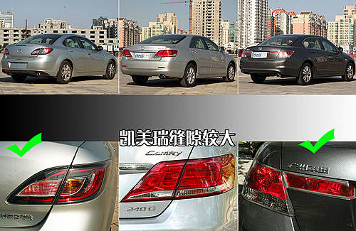 与车头部分相同,这三款车的车尾部分以及大灯周围的接缝同样均匀,整体做工做到了“前后一致”。相比之下,凯美瑞的后行李厢接缝处的缝隙相对较大,但是也体现了日系车所具有的细腻风格。