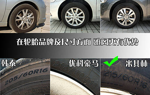 这三款车均采用了多幅铝合金轮毂,睿翼采用了韩泰出品的205/60 R16高品质轮胎,而凯美瑞、雅阁则采用了优科豪马和米其林出品的215/60 R16轮胎。