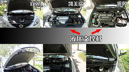 这三款B级车的发动机舱布局比较规整,走线合理。在发动机盖上均辅以隔音材质,在靠近发动机后方的部分也设有隔音、隔热层。美中不足的则是,不过这三款车中只有睿翼的发动机舱盖开启没用采用液压杆的设计。
