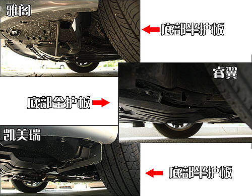 发动机底盘护板可以保护车辆在路过颠簸路面或碎石路面时发动机的安全,而这三款车也均配备了这项人性化配置。不过雅阁与凯美瑞只使用了半护板,而睿翼则使用了全护板,在复杂路面行驶时其底盘增加了一重保护。