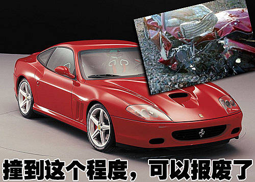 我们注意到这台法拉利550的前半个车身已经完全被撞毁,可见当时的撞击程度也是非常猛烈的。而从破损的车辆向内看,可以发现驾驶室基本完好,座椅都没有受到挤压变形也就是说乘员应该有足够的生存空间。