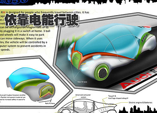 奥迪RM概念车是受曾经推出的RSQ概念车的启发而设计出来的,该车采用的也为磁悬浮技术。其目标消费人群为那些经常往返于各个城市之间的消费者。不过有一点令人遗憾的是该车只能在特定的磁悬浮轨道上行驶。