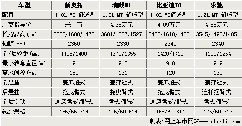 新奥拓的最小转弯半径只有9米,明显小于其他车型,而且最小离地间隙达到150毫米,不管是在城市道路中穿梭,还是在复杂路面行驶,都能够得心应手。底盘方面,新奥拓与瑞麒M1、比亚迪F0一样,采用了前麦弗逊式独立悬架,后拖拽臂式半独立悬架,而且都带有横向稳定杆,舒适性和稳定性也非常不错。在这四款车型之中,只有新奥拓和比亚迪F0采用了前通风盘式制动系统,而乐驰却只采用13英寸的轮胎,与其他车型稍有差距。