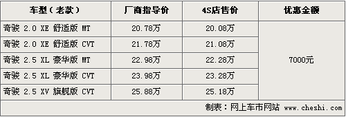 据4S店销售人员介绍,目前奇骏2.5排量车型各款供货都比较充足,2.0排量仍需要预订。现车主要有黑色、银色、灰色等。消费者购车的话可以优惠现金7000元左右,其中2.0排量优惠后售价仅为20万左右,性价比优势比较明显。如果消费者到店看车选购还将有部分让利幅度。