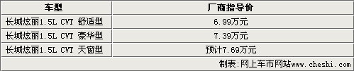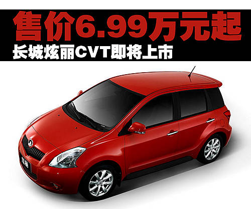 据悉,长城炫丽CVT将在9月2日上市,首先会推出三款车型,其中1.5L舒适型和1.5L豪华型的售价分别为6.99万元和7.39万元。因为炫丽车型一直就没有出天窗版,所以1.5L CVT 天窗版的价格还不明朗,预计在7.69万元左右。目前炫丽CVT已经有部分现车抵达4S店,但因为新车备案原因不能上牌,目前只能够接受预订。