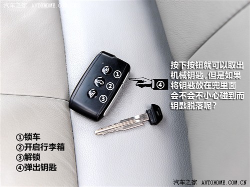 菱悦的遥控车钥匙设计是值得称道的,凹陷的棱角和两侧突出的银色装饰看起来很有档次,突出的挂钩设计也更方便挂一些比较大的钥匙环。美中不足的是遥控按键略小,手指大的人可能会不大方便。