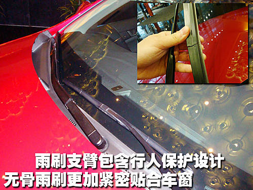 思铂睿的前风挡采用雨点感应式可变间歇式无骨刷,无骨雨刷可以有效的保持前风挡的干净。
