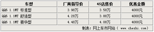 据奇瑞QQ6专营店销售人员介绍,奇瑞QQ6系列车型比较齐全,目前全系都有一定的优惠幅度,除现车较少的车型需要提前预订以外,全系车型均可以优惠4000元。