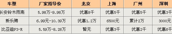 编辑点评:长城炫丽推出CVT无极变速器是开辟了新的创举,目前A0级别的车型在国内也备受关注。随着油价的不断高涨,且国家购置税减半政策的推行,小排量的车型的性价比尤为突出。而长安铃木雨燕的1.5LCVVT发动机也是受到很多年轻人喜欢,只是价格一直居高不下。而新乐骋虽然没有心乐风销量那么好,但是也是雪佛兰好卖的车型,目前市场优惠还可以,比较的实惠。另外,比亚迪F3的两厢代表车型的市场远不如三厢车那么如鱼得水,而且市场让利幅度也无大的波动,所以不是太被消费者接受。