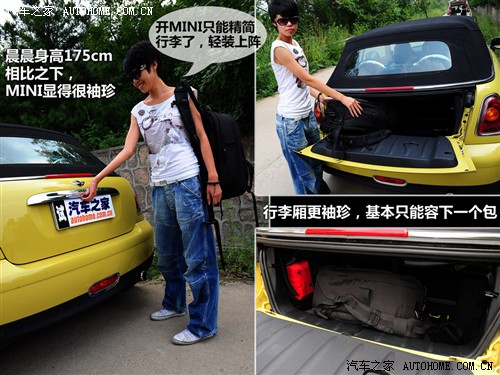 后备厢跟MINI的身形一样袖珍,基本只能放得下一个大点的背囊,不过好在上层盖板可以掀开,增加了开口的宽度,也就一定程度地提高了载物能力。虽说能力不强,但谁又会忍心对这么一个小精灵提出太过实用性的要求呢,哦,除了晨晨以外。