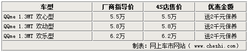 而问及刚刚上市不久的QQme新车,经销商表示现阶段虽然没有现金优惠,不过购车均可享受2000元的保养赠送,但不能折换现金。三款车型的颜色主要为蓝色车型,其他颜色需要预订,订金1000元,一个星期左右便可提车。