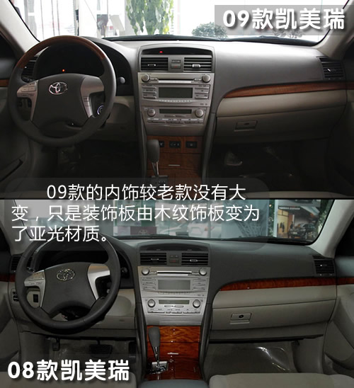 与外形只是细节小改相同,09款凯美瑞的内饰也没有给我们带来太多新意。大面积的亚光饰板取代了原先的木纹装饰,显得更有档次——避免再被人指责为塑料感强烈的尴尬。