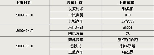 在“金九银十”的销售旺季中,许多汽车厂商都选择在这个时候推出自己的新车。下周从16号-18号就有8款新车将集中上市,它们分别为新奥拓、奔腾2010款B70、长城迷你SUV、标致新307、陆风X8、奔驰E双门轿跑、雪铁龙C4轿跑车和三菱新帕杰罗,其中自主品牌车型占了主要部分。汽车厂商选择在这个时期集中推出新车,不仅可以在“金九银十”的销售旺季提升销量,而且也为消费者提供更多的车型选择。