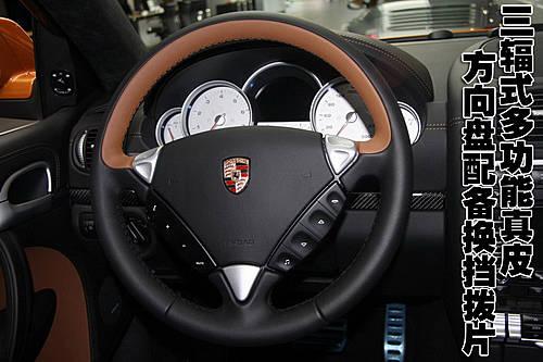 保时捷卡宴Turbo S三辐式多功能方向盘采用真皮材质,手感舒适且做工考究。通过方向盘上的换挡拨片可实现类似跑车的手动换挡,突显驾驶乐趣。而集中在方向盘左右的快捷按钮触手可及,方便日常使用。
