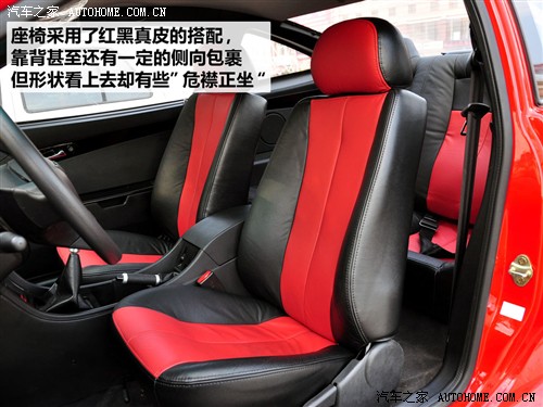 前后座椅都实用了红黑搭配的真皮材质,但前排座椅的形状就像是一个等待老师批评的小学生一样非常拘谨而紧张地站在那里,侧向包裹看上去还可以但总体的形状并不出色。相比较而言,后排座椅则很容易让人产生试一试的冲动,看上去内部填充物很充足,只不过两点式的安全带稍有些说不过去。