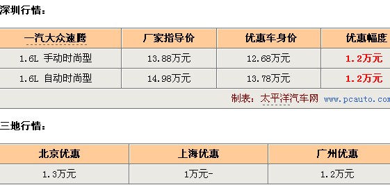行情点评:速腾近期的人气可算是红火到极点,优惠也一直维持在1.2万元上下,并没有太大波动,但缺货现象一直没有得到解决。
