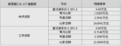 贷款详解:新君越新上市不久,目前仍需要加价提车,现在实行的分期付款购车,分为两年及三年付款两类,买车的朋友可以根据自己的实际能力选择贷款项目。首付款为净车价的三成,也就是在9.69万,当然编者所列的车型是新君越的最高配,按照比例来计算的话其它版本的车型首付款要低于9.69万。