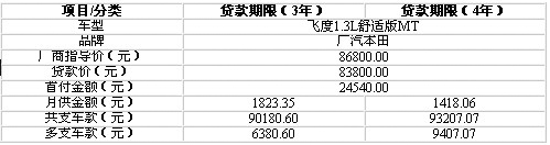 贷款详解:飞度是小型家用车的典范,这点从它的销量上就能看出来。缺点么,可能就是大家比较关心的安全和价钱问题。总体来说,飞度综合素质较高,是第一台车的好选择。该车首付需2万余元,月供仅需1400余元,对于手头紧张的消费者来说还是比较划算的。