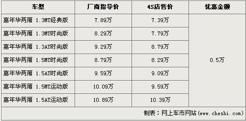 据北京福特经销店销售人员介绍,近期购买福特新嘉年华的用户可以得到5000元的优惠,全系最低配的1.3L手动经典版售价经优惠后,售价降到了7.39万元。销售人员还介绍,两厢新嘉年华的1.3L车型已经停产,店内现车也不是很充足,欲购买此车型的消费者应及时出手。