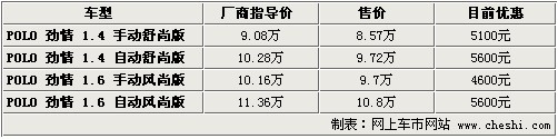 据4S店销售人员介绍:目前POLO劲情全系仅为4款车型。之前的1.4升手动挡两款车型合并为1.4手动舒尚版,1.4升自动挡两款车同样合为1.4自动舒尚版。其余1.6升两款车型不变。目前全系最高优惠5600元,其余三款车优惠幅度都有所不同。目前全系无现车,预定需等2周至1个月时间。根据车型及颜色不同,订车时间也不同。