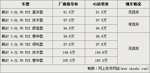 据北京奥迪4S店销售人员介绍,新款的奥迪Q7有三个排量共7款车型,售价区间为81.5万元-165万元。目前店内已经到第一批先期预订的奥迪新Q7现车,车型为3.6L技术型和3.6L舒适型。现在欲购买新Q7的消费者需交1万元订金,下个月中旬方可提车。