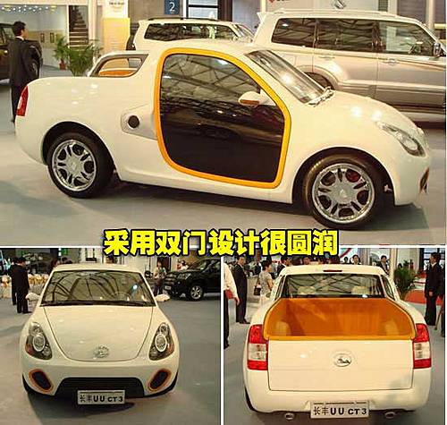 长丰UU CT3在两年前的上海车展以概念车的形式亮相,从外形特征和整车尺寸来看,长丰UU CT3很有可能是长丰微型轿车的皮卡版本。通过谍照可以看到,这款车的外形与之前亮相的概念车基本无异,就算是轮毂造型也采用同样的设计。