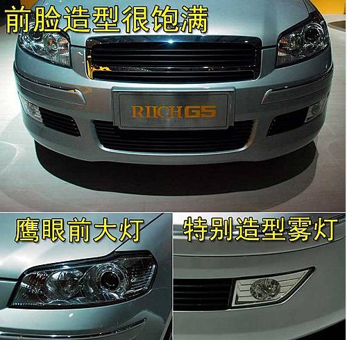 瑞麒G5具有潮流感极强的商务运动外型设计,长方形的镀铬装饰进气格栅,使整个前脸看上去更具几分侵略性。前大灯采用鹰眼式设计,雾灯的造型比较特别。瑞麒G5的尾部线条非常流畅,与奇瑞东方之子生硬的尾部造型有明显的差别。这款新车采用一体式尾灯,红白相间的设计更显几分大气。另外,瑞麒G5尾部还配备了四点式倒车雷达探头。