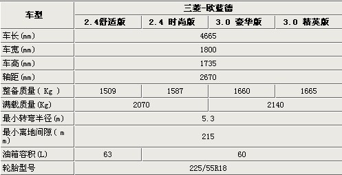 全新一代三菱欧蓝德的身尺寸达到了4665mm;1800mm;1735mm,保证了其内部横向空间及头部空间的宽敞。2.67米的轴距为新欧蓝德提供了舒适的内部空间。新欧蓝德的最小离地间隙为215mm,足以适应一般道路的路况,同时5.3m的最小转弯半径,也可以适应中国地区道路窄小的特点。60升的油箱,可以保障人们日常出游的需要。