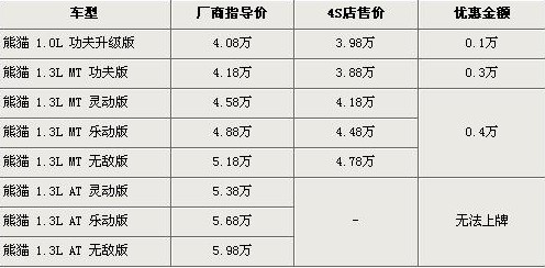 据吉利汽车4S店销售人员介绍,吉利熊猫近期有最高4000元的优惠。新推出的1.0L车型优惠为1000元,售价降到了3.98万元。1.3L手动功夫版优惠3000元,售价降到了3.88万元,其他手动挡车型优惠4000元。由于熊猫1.3L自动档车型尾气排放不合格,所以无法在北京上牌照。销售人员还介绍,目前1.0L车型较紧张,1.3L车型现车充足。