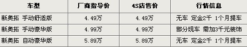 据长安铃木北京地区4S店销售人员介绍,目前新奥拓销售火爆,只有手动豪华版有现车,以蓝色、白色、金色为主,提车需要在4S店加装3000元装饰。其余车型及颜色需要预订,定金为2000元,最快1个月可提车。北京地区各4S店由于订单不同,各店销售的现车颜色有所不同。