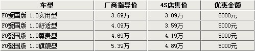 据比亚迪汽车4S店销售人员介绍,比亚迪F0爱国版igo系列车型的现车并不是很齐全,实用型和舒适型都有现车,尊贵型和旗舰型则需要预订,大概10-15天即可提车。而目前1.0L实用型和舒适型都有现车,其中实用型可以优惠6000元,优惠后售价已经接近3万;而其他车型只可以优惠5000元现金。