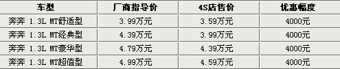 据长安轿车4S店销售人员介绍,奔奔目前现车都比较齐全,但与上月相比,优惠幅度明显有所减少。目前奔奔1.3L四款车型只能优惠4000元,比前一段时间少了1000元。但销售人员也表示,如果消费者到店详谈,还可能有进一步优惠的余地。