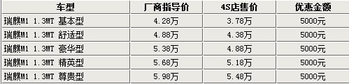 据奇瑞瑞麒4S店销售人员介绍,目前瑞麒M1只在专属瑞麒4S店内销售,其它奇瑞的4S店并没有这款车的销售权。现在店内1.3L的瑞麒M1车型已经非常齐全,并且颜色较为丰富,全系均可享受5000元的现金优惠。除购买1.3L瑞麒M1现金方面可优惠5000元外。销售人员还表示,倍受消费者青睐的1.0L车型现在店内也可以优惠3000元,虽然没有1.3L车型的优惠金额大,但也相当的具有诱惑力。各家店内同样车型较为齐全。