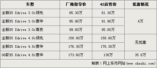 据经销商处销售人员介绍,店内还有一辆售价为173.6万元的08款X5 4.8i豪华版现车,目前此批车有35.6万元的优惠,经优惠后售价降到了138万元。销售人员还介绍,新款X5-30i车型有4万元的优惠,4.8i车型没有优惠。