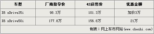 据北京宝马经销店销售人员介绍,现在在售的X6车型分为售98.3万元的35i车型和售价为177.8万元的50i两款车型。店内没有35i车型的现车,消费者需要交订金10万元,待店内到车后提现车还要加价3万元,售价从98.3万元上升到了100.3万元,排量更大的4.4升的50i车型有21万元的现金优惠,售价降到了156.8万元。销售人员还介绍,50i车型现车店内也不多,欲购买的消费者需加快购买脚步。