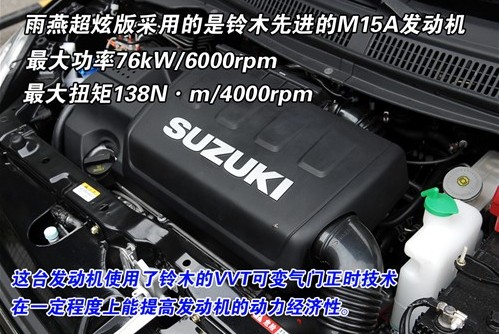 售价达到9.88万元的1.5炫酷版AT在强调性价比的雨燕全系中是顶配车型,因此势必要配备一些豪华型配置。诸如全车六安全气囊、多功能方向盘以及自动空调都是小型车中少有的。而此车型搭载的1.5L发动机更是值得推荐。这台M15A发动机是雨燕上市一段时间后才追加的动力单元,目的就是提高雨燕的动力表现。1.5L发动机采用了全铝材质重量更轻,同时配有VVT可变气门正时系统,在燃油经济性方面也得到了提升。