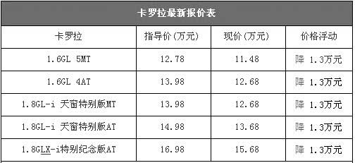 最近一段时间,卡罗拉的销售情况一直都非常不错,因此其价格相对来说也比较稳定。近日,我们从北京的一些一汽丰田汽车综合经销商处了解到,目前卡罗拉可优惠1.3万元,比9月份的价格下降了3000元,和其历史最低价已经非常接近。以下是卡罗拉部分车型最新报价表: