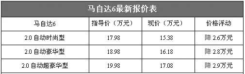 马自达6是一款非常经典的车型,现在更是凭借着突出的性价比持续热销。昨日,我们从北京地区的一些一汽马自达汽车综合经销商处了解到,近期马自达6的价格稳定,降幅在2.8万元左右,其中马自达6 2.0自动时尚型目前的售价为15.38万元,性价比非常不错。以下是马自达6最新详细报价表: