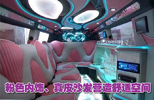 这款加长版悍马H3内部装饰也是粉色作为主色调,除了配置了舒适的真皮沙发外,车厢内部的配置还有X3电视、DVD播放器、舞台灯、1800瓦的音响系统等。车身外观上配置的为22英寸的铬合金轮毂。