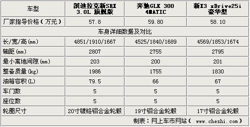 凯迪拉克新一代SRX已于本月12日上市,上市的2款车型售价分别为49.8万元、57.8万元,装备了3.0升V6全铝直喷发动机的新SRX,不仅在动力性能上赶超上一代3.6升发动机,更小的排量在燃油经济性上也可圈可点。新SRX的上市无疑给对手们施加了更大压力,其最大竞争对手锁定为奔驰GLK与宝马X3,论品牌豪华度及价格区间,我们毫不犹豫的选择后两者。60万元左右的价格,到底谁更能打动你?下面的对比我们为您揭晓。