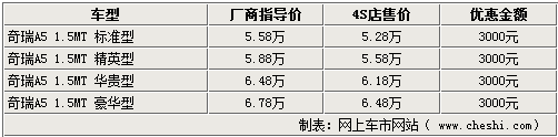 据奇瑞4S店销售人员介绍,目前各点内均主要销售1.5升的A5车型,老款的A516已经停产,4S店都已经没有库存车销售,未来也不会再投产进行销售。目前奇瑞A515精英型等车型在店里都有现车销售,为迎接国庆以及中秋双节的来临,现在购A5全系均可享受3000元的优惠。